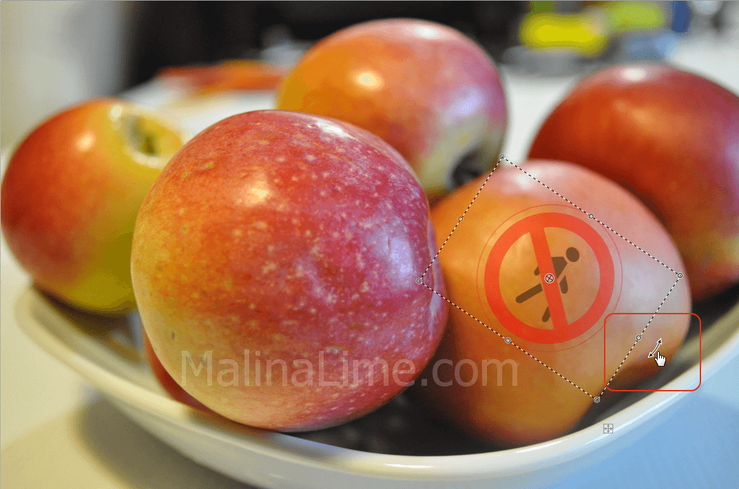 Чтобы изменить угол наклона водяного знака подведите мышку к одной из сторон выделенного пунктиром периметра второго слоя. Появится изображение полукруглых стрелочек, с помощью которых можно поворачивать знак.