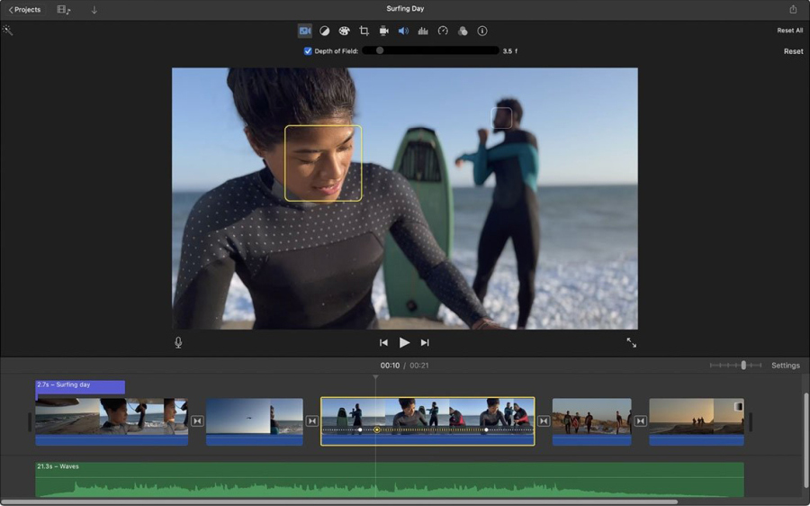 У iMovie современный, интуитивно понятный интерфейс и временная шкала, которая позволяет использовать несколько дорожек для видео и аудио. Базовый набор инструментов включает в себя обрезку, стабилизацию видео, цветокоррекцию и даже удаление фонового шума. Как и Kapwing, iMovie позволяет использовать в работе шаблоны, в частности, фоны и анимированные текстовые элементы. Галерея шаблонов iMovie не такая внушительная, как у Kapwing, но тем не менее, это удобный инструмент для экономии времени в процессе создания простых видеороликов.