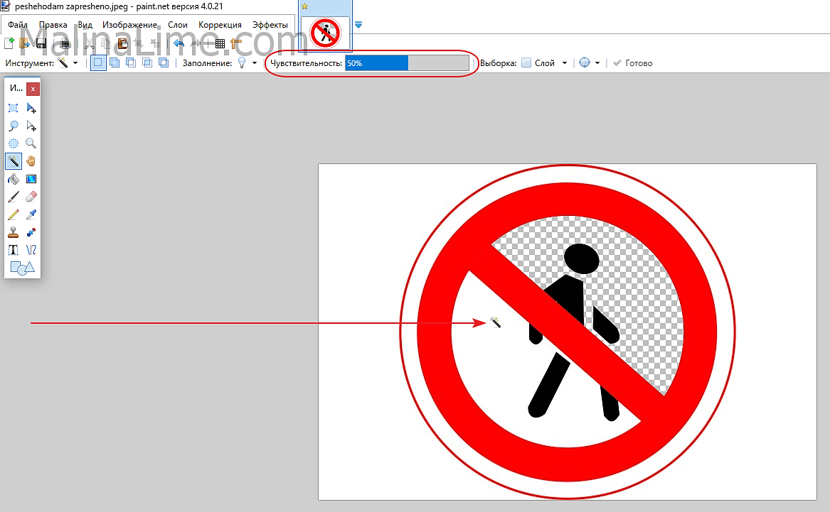 Волшебная палочка нужна для выделения области, отличающейся по цветовой гамме от соседних областей. Чувствительность инструмента можно регулировать. В примере она установлена 50%, за счет большой визуальной разницы между заливками чувствительность может применяться и меньше. Но если в Вашем рисунке контраст между удаляемой областью и соседней незначительный, повышайте чувствительность волшебной палочки.