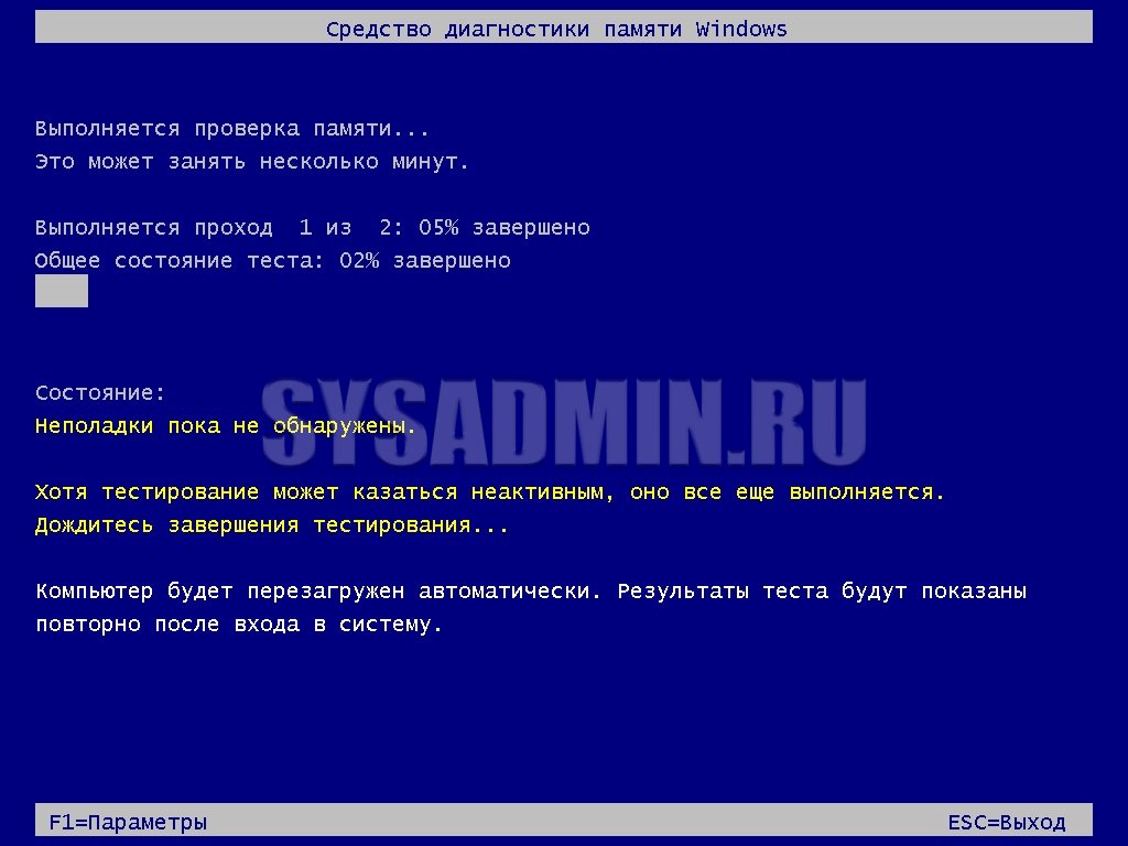 После перезагрузки начнется сам процесс проверки памяти, время прохождение которого будет прямо пропорционально количеству проверяемой памяти — чем больше, тем дольше.
