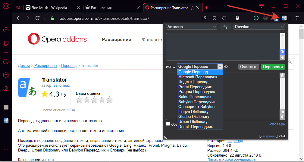 Таким же образом можно установить в Оперу любое другое дополнение, выполняющее функции переводчика.