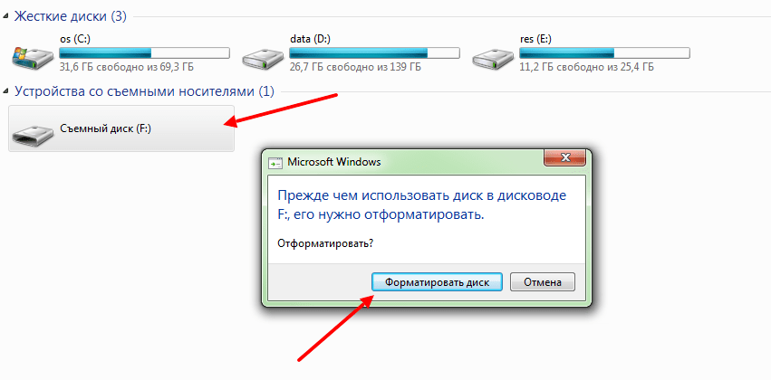 В таком сценарии мы можем просто отформатировать этот диск или раздел стандартными средствами Windows (по сути, можно просто согласиться на предложение форматирования в проводнике «Чтобы использовать диск, сначала отформатируйте его)