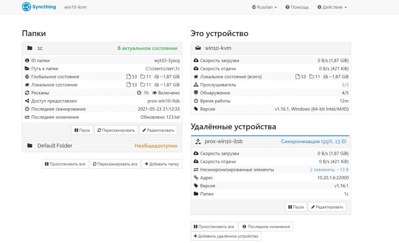 И всё! После этого начинается двухсторонняя синхронизация этой директории. Сюда же можно добавить еще несколько систем. Таким образом все они будут синхронизировать одну и ту же директорию. Если вы не хотите соединяться через публичные релеи, можете поднять свой. Любо просто настраивать подключения по ip.