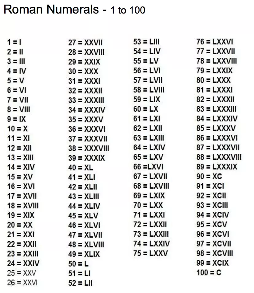 Чаще всего для записи дат используются римские цифры, а точнее дни, месяцы или столетия. В таблице показаны значения римских цифр от 1 до 31, так что вы можете быстро перевести арабскую нотацию числа в римскую.