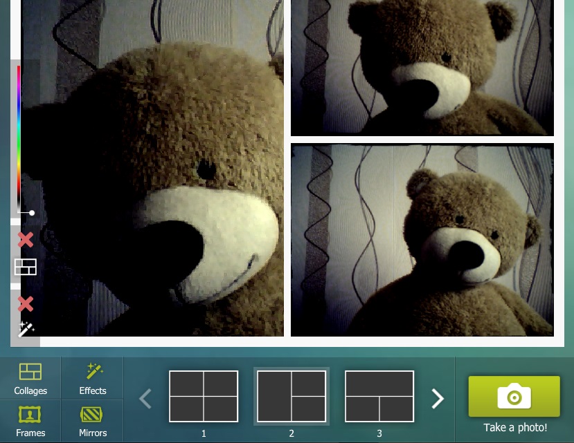 4 Вот так выглядит сам сервис создания снимков с вебкамеры. По центру – кнопка для съемки, слева от нее различные эффекты, есть и забавные по типу искажения и прочего, а справа расположены таймеры и функция коллажа. В этом режиме можно наделать множество различных фотографий всего за несколько секунд