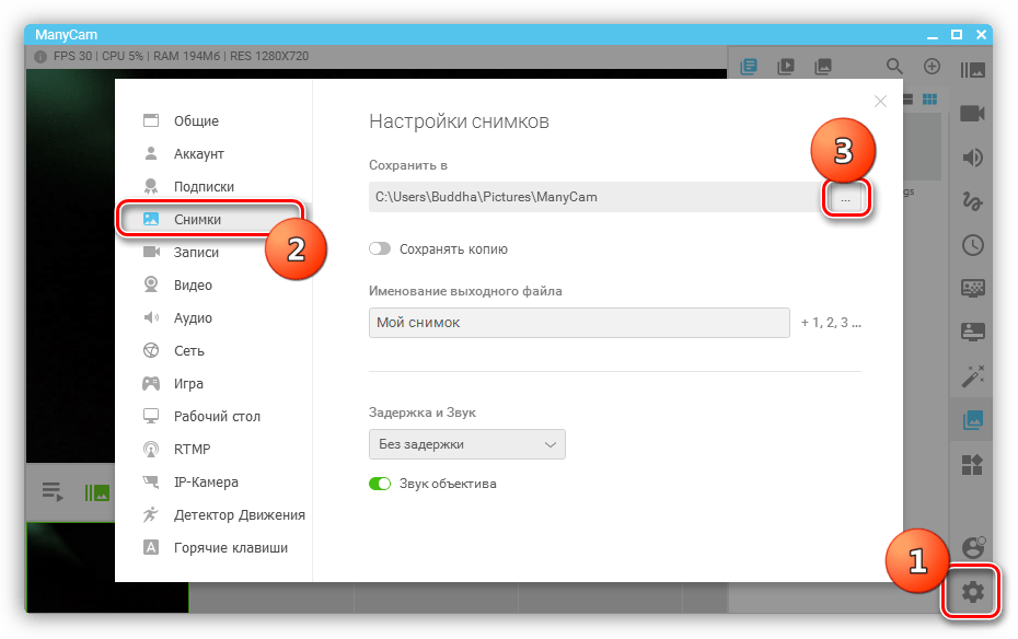 Далее предлагаем сразу открыть список доступных настроек, чтобы выбрать активную камеру и задать дополнительные параметры съемки.