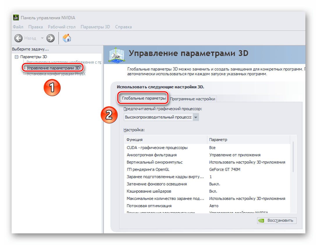 - Выберите в левой половине окна раздел «Управление параметрами 3D», а затем справа активируйте блок «Глобальные параметры».