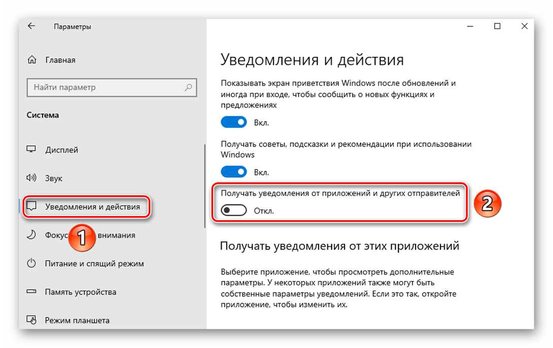 - После этого появится перечень настроек. В левой части окна перейдите в подраздел «Уведомления и действия». Затем справа нужно найти строку с названием «Получать уведомления от приложений и других отправителей». Переключите кнопку рядом с этой строкой в положение «Откл».