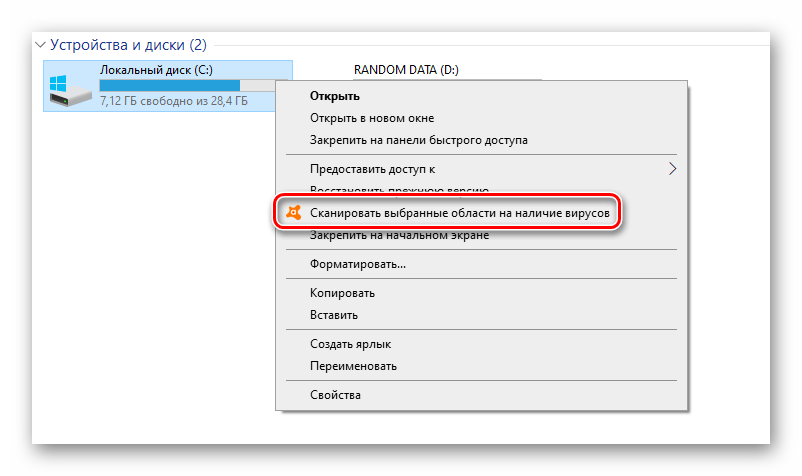- Выберите объект для проверки на наличие вирусов и кликните по нему правой кнопкой мышки. При необходимости можно выбрать сразу все жесткие диски. В контекстном меню воспользуйтесь пунктом «Сканировать выбранные области на наличие вирусов».