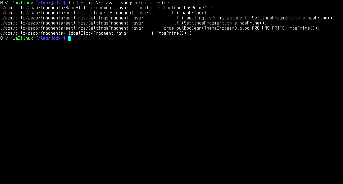 Все, что он делает, — просто возвращает значение поля mHasPrime, однако интересен он не этим, а своим именем. Дело в том, что платная (точнее, оплаченная) версия ASAP называется Prime, и очевидно, что метод hasPrime как раз и нужен для проверки оплаты приложения. Чтобы подтвердить свою догадку, сохраним декомпилированные исходники (File -> Save all) в каталог и попробуем найти в них вызовы hasPrime():