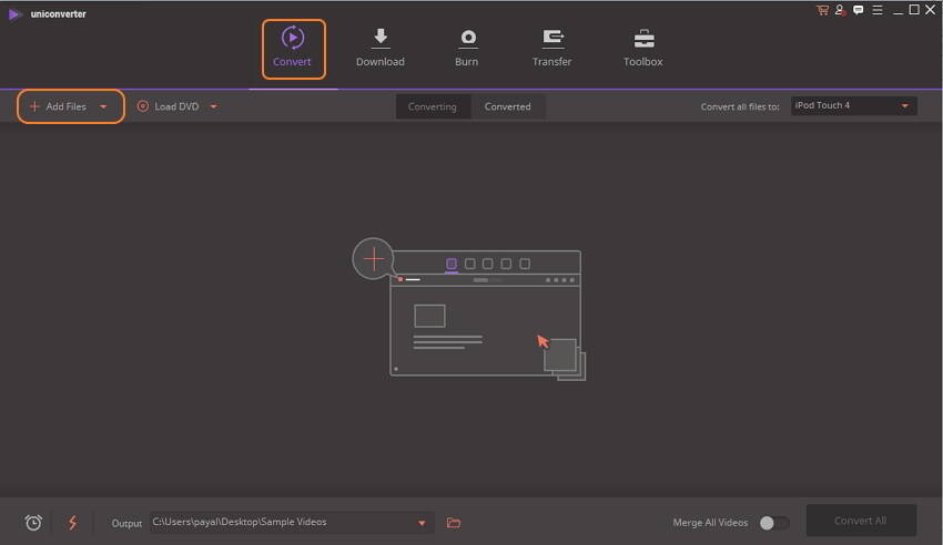 Загрузите видео-аудио конвертер Wondershare с официального сайта или загрузите ссылки выше, затем быстро установите и запустите его. По умолчанию вы перейдете к вкладке Конвертировать .Нажмите кнопку +Добавить файлы для просмотра и импорта локальных видеофайлов для конвертации. Перетаскивание также доступно здесь.