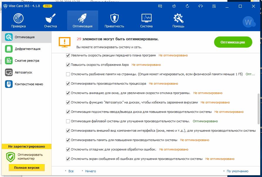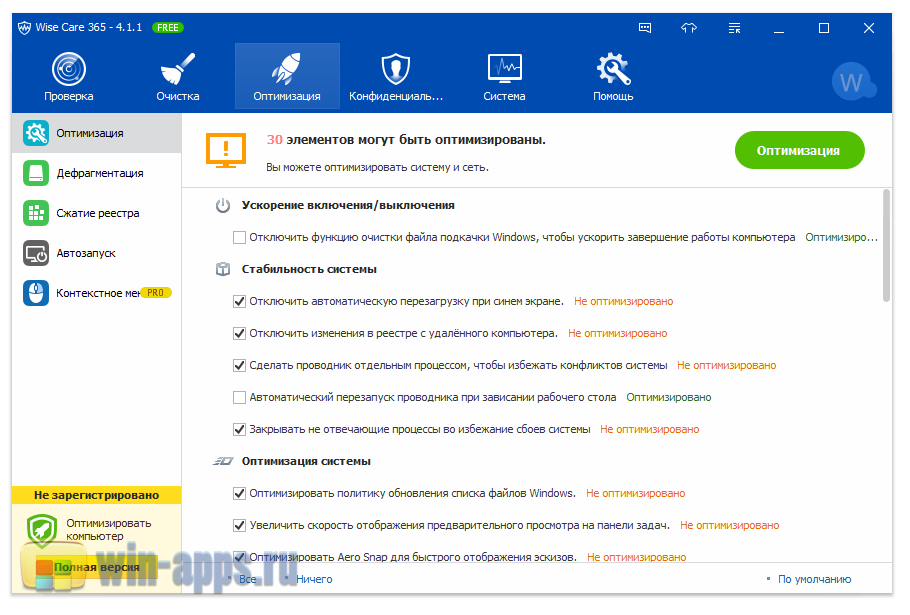 Первая функция в этом списке – это оптимизация. Благодаря этому инструменту Wise Care 365 может провести анализ всех аспектов ОС и предоставить пользователю список возможных изменений, которые помогут увеличить скорость работы Windows.