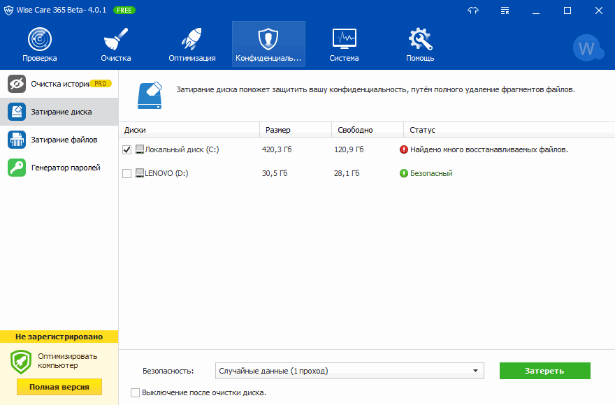 Однако в ней есть и такие функции, которые без должных знаний лучше не трогать. Одна из них — стирание дисков. Если случайно перепутать ее с очисткой диска (встроенный инструмент оптимизации Windows), можно навсегда потерять какие-либо важные данные, так как программа уничтожает их безвозвратно.
