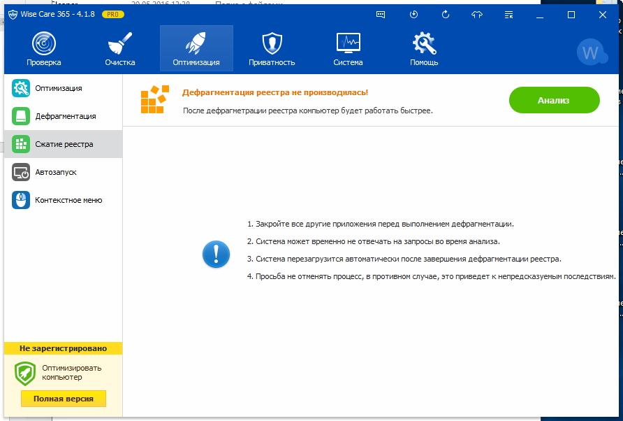 - Оптимизация системы. Бесплатная версия программы Wise 365 позволяет выполнить оптимизацию файлового пространства жесткого диска. Чтобы выполнить операцию, необходимо запустить скаченный сервис, найти поле «Оптимизация», кликнуть по строке «Дефрагментация» и подождать некоторое время, пока прога будет выполнять анализ системы. Также в разделе «Оптимизация» находится функция «Сжатие реестра». С ее помощью можно ускорить работу Windows.