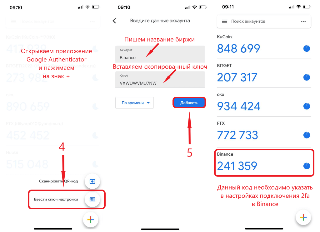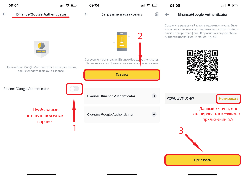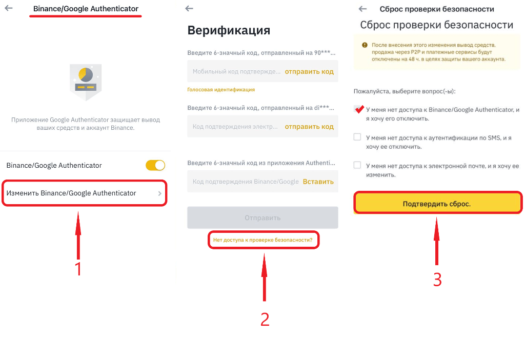 Возвращаемся на «Бинанс» и подтверждаем действия 3 кодами верификации. Это последний шаг при подключении дополнительной защиты.
