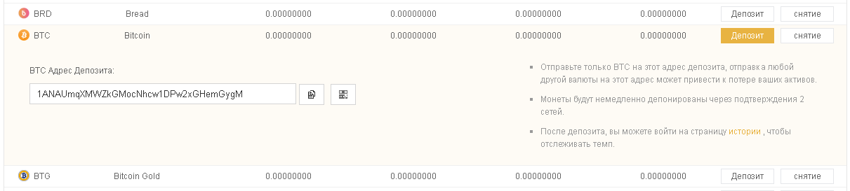 Далее все интуитивно понятно: выбираем нужную криптовалюту, переводим средства на указанный кошелек и дожидаемся зачисления их на баланс. Вывод средств работает аналогично.