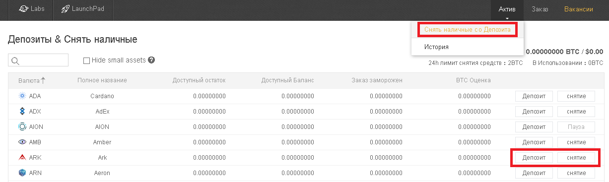 Выбираем пункт «Актив» – «Снять наличные с Депозита». В открывшемся окне будет доступен и ввод, и вывод средств. Также можно нажать на «Hide small assets», чтобы скрыть нулевые балансы в списке криптовалют.