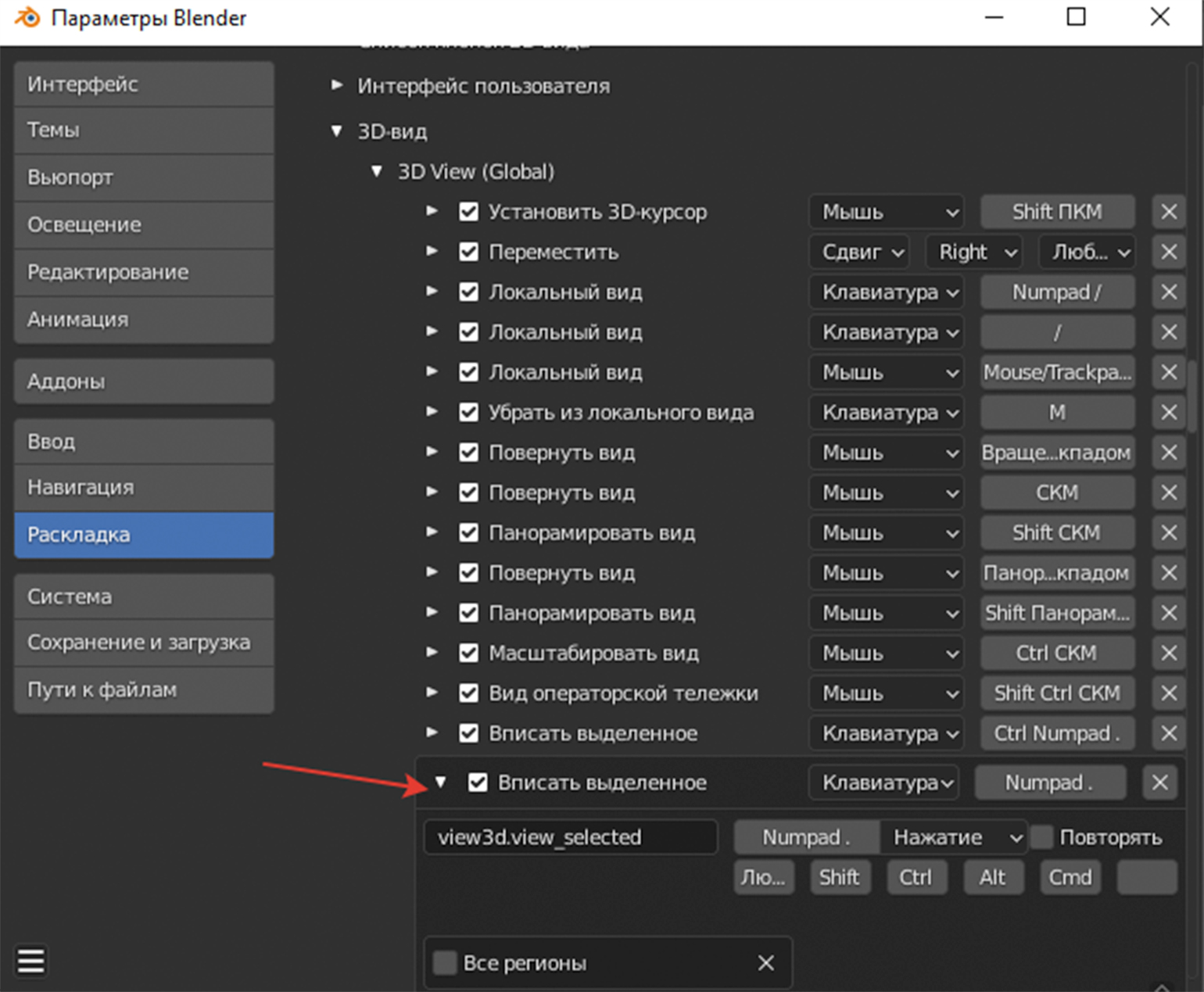 - Также на конкретное действие можно назначить новую клавишу: Правка (Edit) — Настройки (Preferences) — Раскладка (Keymap) — 3D вид (3D View) — 3D View (Global) — Вписать выделенное (View Selected).