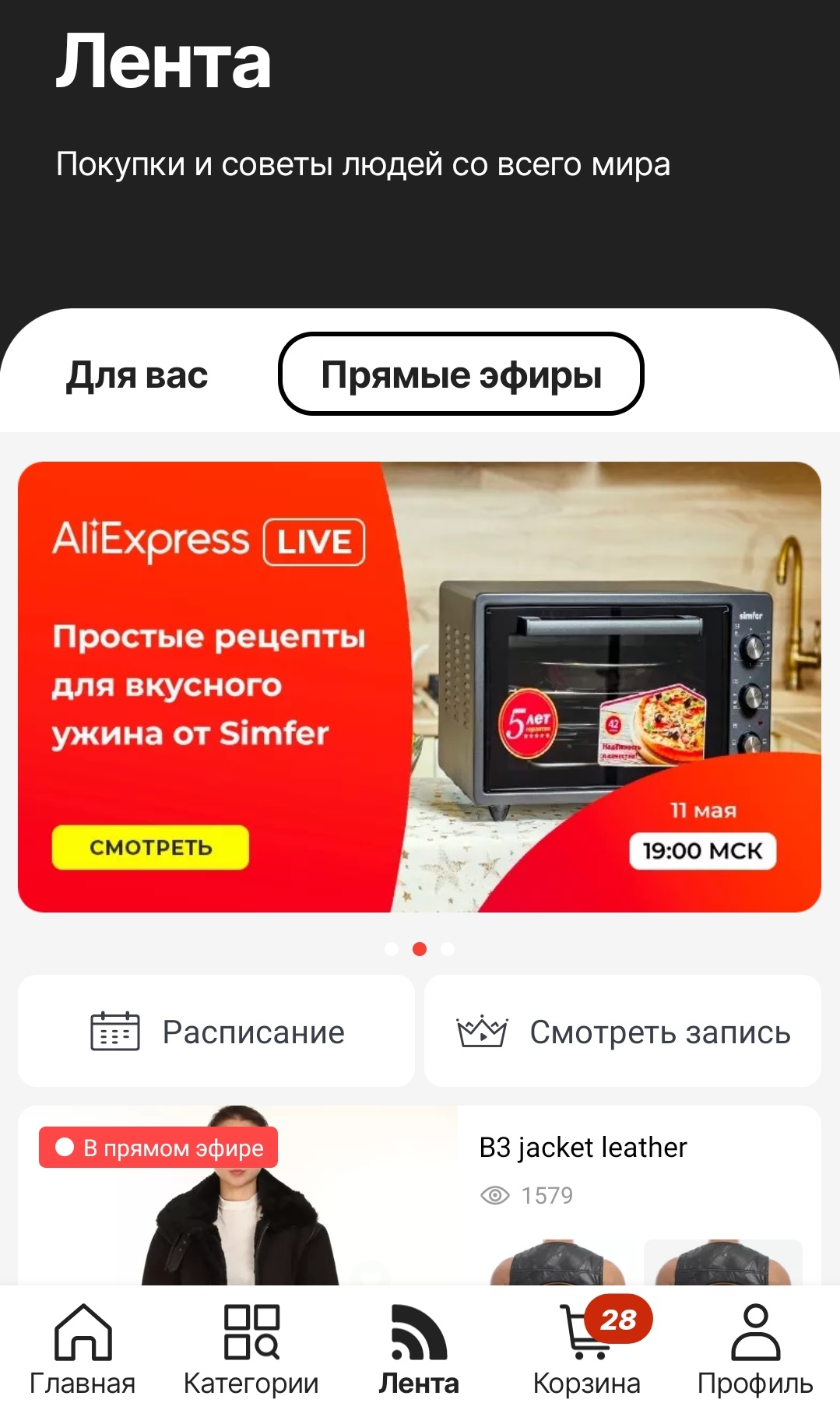 «Прямые эфиры» — блок с расписанием, записями и напоминаниями о начале трансляций магазинов и блогеров.