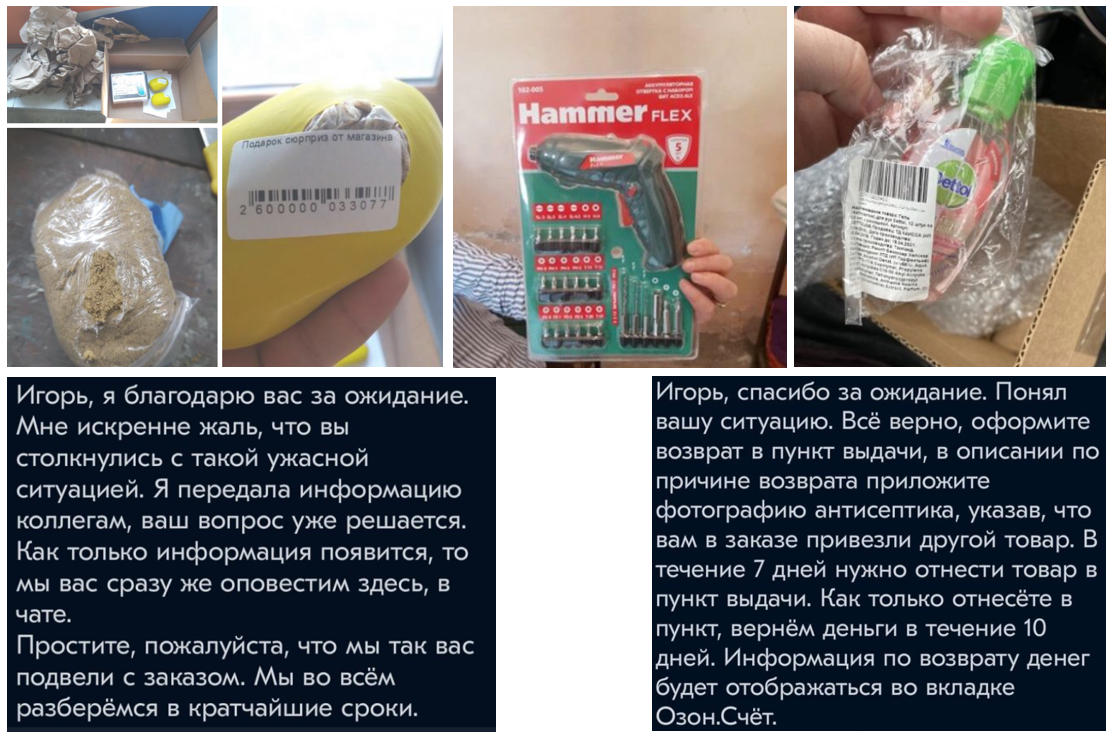 Ozon, по аналогии со своим «младшим украинским братом» платформой OLX привлекает к себе мошенников всех мастей. В сети масса примеров, когда покупателям, вместо, например, шуруповёрта «Makita» реклы отправляют дешманские китайские подделки, или попросту строительный мусор. Также есть примеры, когда люди вместо элитной парфюмерии получают в посылках антисептик или тому подобную дешевую бытовую химию.