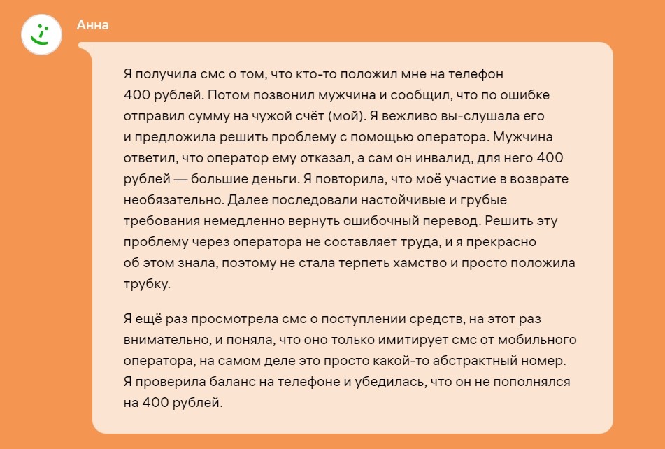 Текста самые разные, что говорит о хорошей фантазии злоумышленников: говорят что пополняли счет ребенку, мужу, сестре, брату, родителям. Давят на жалость, рассказывают о трудной жизни, прикидываются бабушкой, которая не разбирается в телефоне и просят «вернуть» средства. Это старый ЛОХОТРОН. Однако добрые и наивные люди часто попадаются на эти уловки.