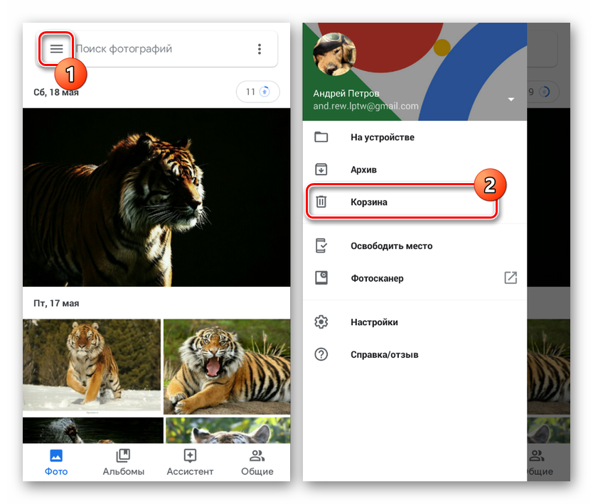 - Доступна корзина в данном случае через главное меню Google Фото. Чтобы просмотреть список удаленных файлов, выберите одноименный пункт.