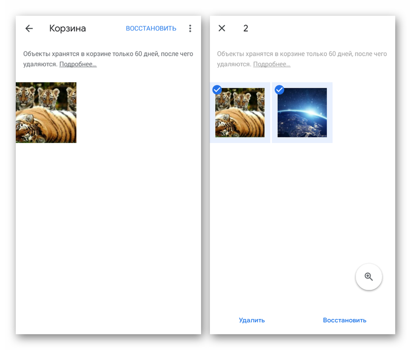 Если вы пользуетесь официальным приложением Google Фото, предназначенным для автоматической синхронизации графических и видеофайлов на смартфоне с облачным хранилищем, можно также воспользоваться корзиной. Как и в ситуации с облачными сервисами, удаление в корзину производится после включения синхронизации и только через главное меню программы.