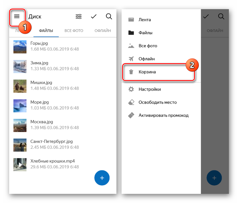 Найти раздел вы можете через основное меню, развернув его в левом углу экрана и выбрав пункт «Корзина». Учтите, при отсутствии синхронизации в корзину будут удаляться копии файлов из облака, а не с устройства.
