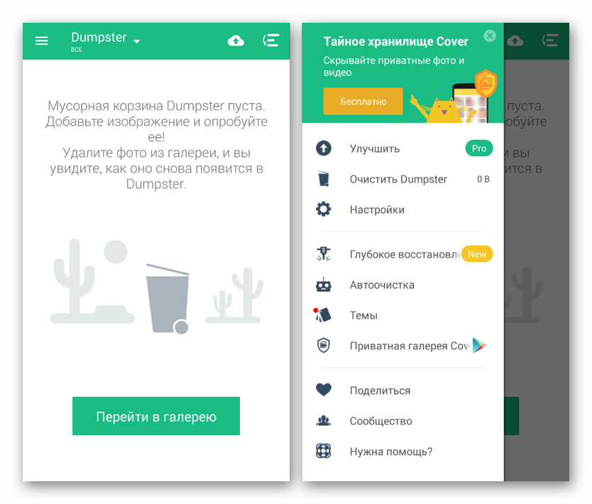 Dumpster — бесплатная программа, которая заменяет «мусорное ведро». После удаления файл находится в специальной папке с возможностью восстановления в любой момент. Для этого необходимо зайти в корзину на Самсунг, выбрать медиафайлы для восстановления и вернуть их на прежние места в телефоне. При покупке платной версии данные можно хранить в специальном облаке. Полезные функции софта — быстрое восстановление случайных документов и медиа, блокировка экрана для защиты фото. Программа переведена на 14 языков, имеется опция автоматической очистки.