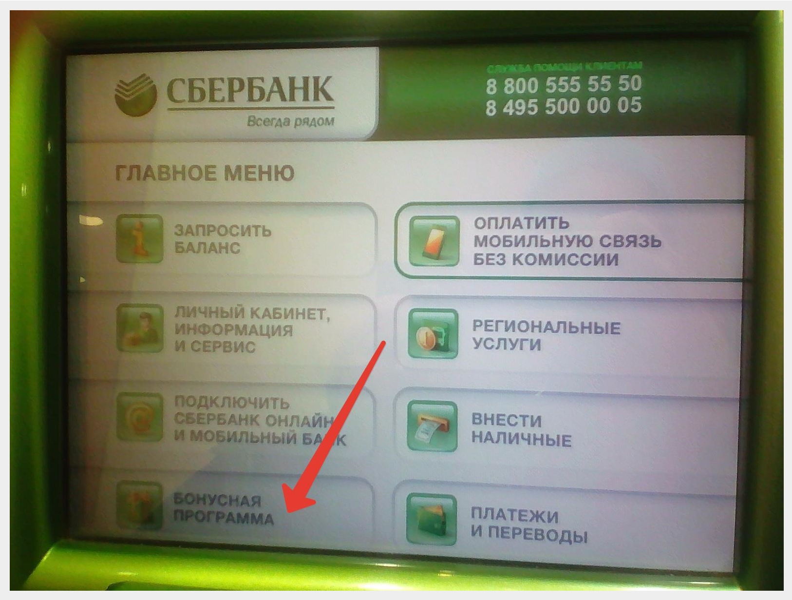 - С помощью банкомата. Вставив карту, набрать ПИН-код. В главном меню найти раздел «Бонусная программа» и там ввести номер мобильного телефона, после чего на указанны номер поступит код доступа с Контактным центром.