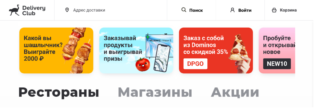 - Авторизоваться на сервисе «Delivery Club» в браузерной или мобильной версии.