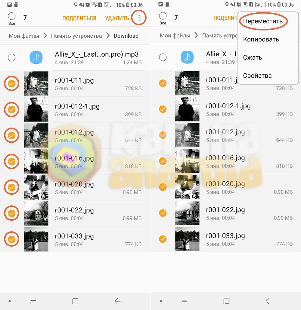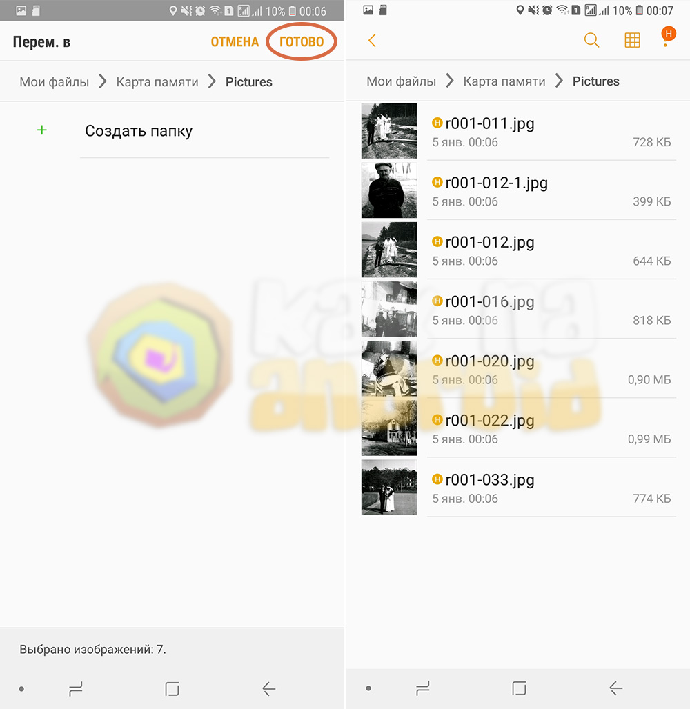 - Выбрать место, куда надо переместить фотографии (SD-карта).