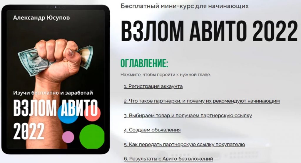 И для меня, пожалуй, главным уроком был пятый! Александр рассказывает, что делать и как передавать партнерскую ссылку покупателю с Авито. Потому что в Авито вообще не разрешают ставить ссылки! И вот как работать так, чтобы эту ссылку покупатель все-таки получил Александр расскажет. Это ценнейшая информация о которой говорит в этом уроке Александр! Он рассказывает и показывает, как работать так, чтобы все-таки ваша ссылка попала покупателю. Он по ней покупает, и вы получаете свои комиссионные.