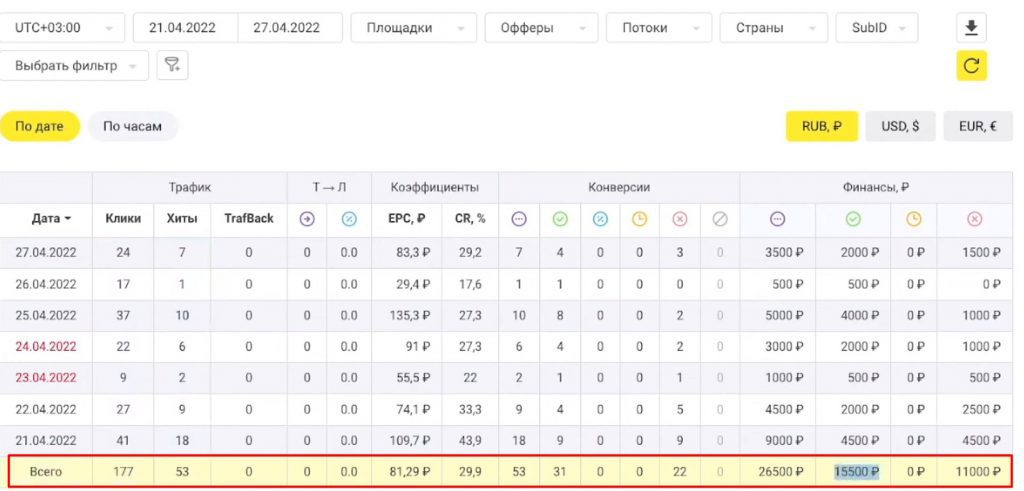 У него за апрель было 177 кликов и он показывает сколько было конверсий и продаж на 15 500 рублей. Он всегда постоянно показывает свои результаты по работе с партнерками.