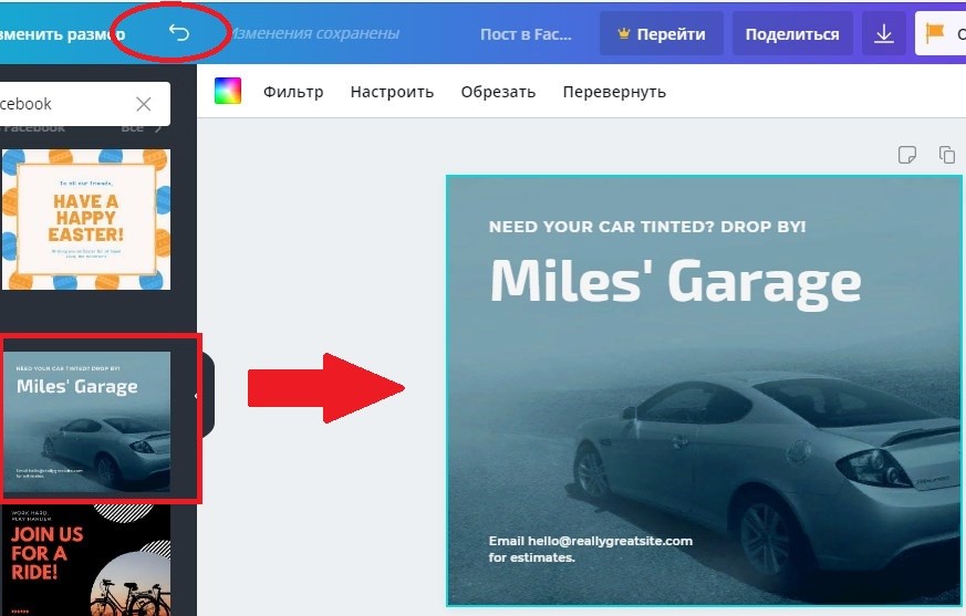 Двойным кликом заготовка перемещается на рабочее окошечко. При необходимости изменить шаблон, отмените действие, нажимая изогнутую стрелочку вверху экрана.