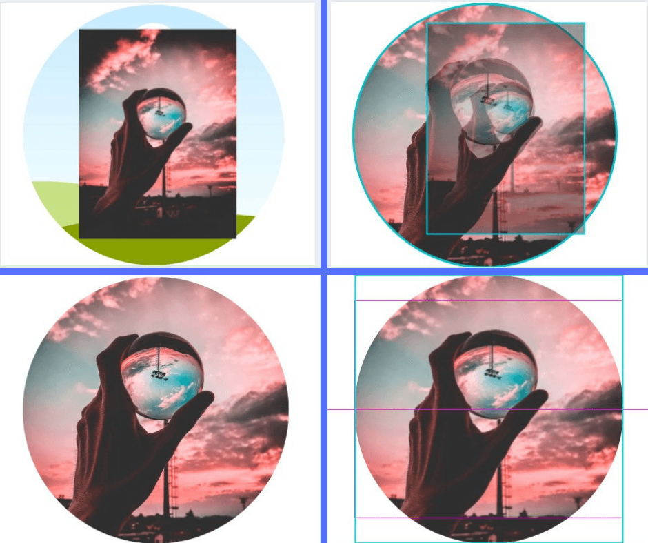 На последнем изображении картинку выравнивала по центру. Для этого просто перемещайте круг по основе, пока не появиться вот такая сетка (фиолетового цвета).