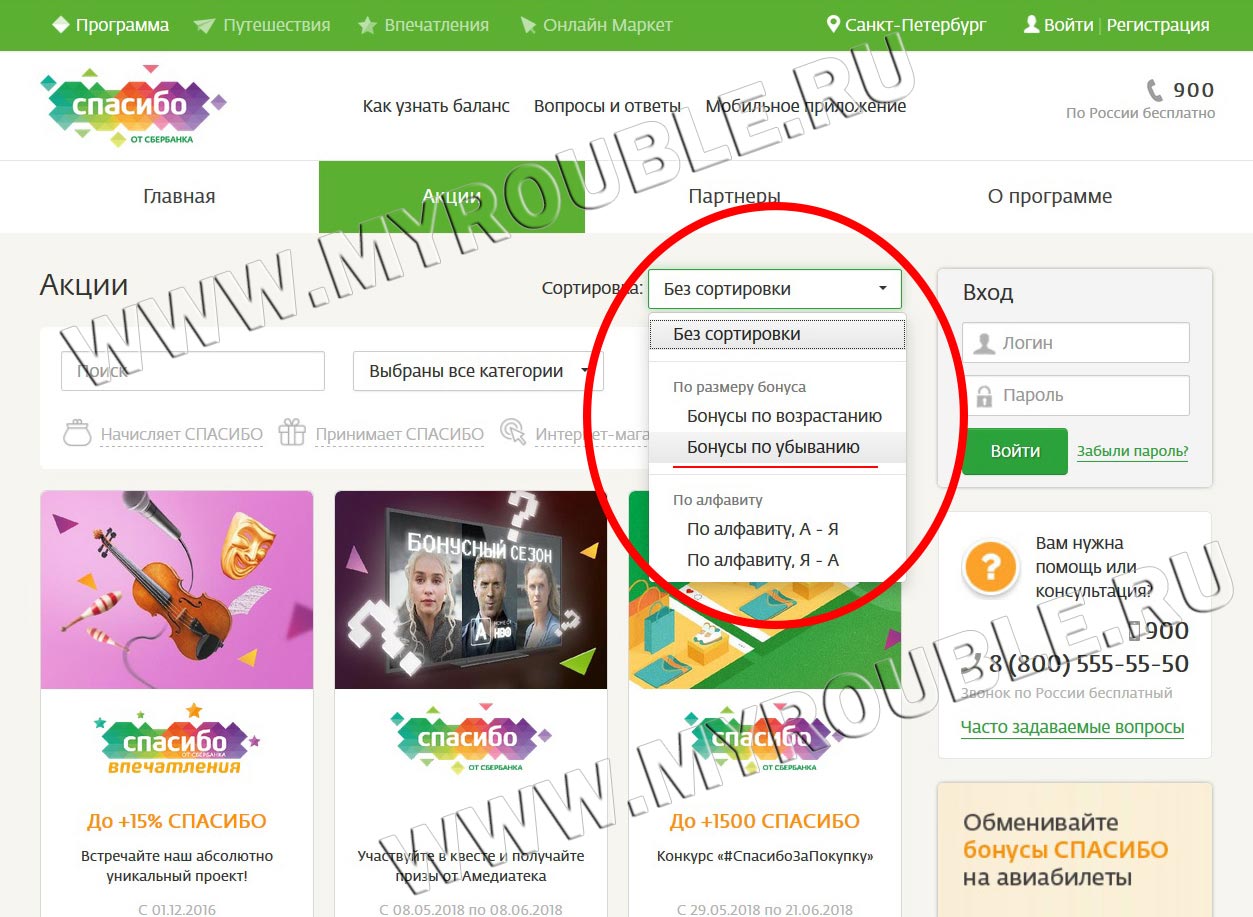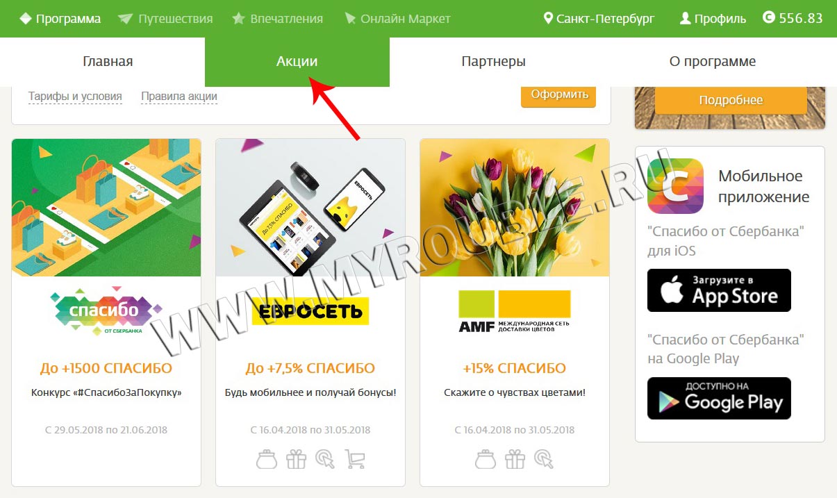 - Входим на https://bonus-spasibo.ru/sbrf/, в линейном меню выбираем «Акции»
