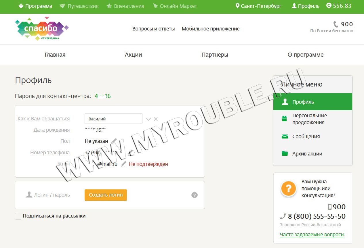 - Для полного счастья настраиваем профиль личного кабинета, нажав на пункт “Профиль” в верхней строке. Впрочем, можно ничего и не настраивать, если планируете входить в интерфейс бонусной программы только через Сбербанк-онлайн.