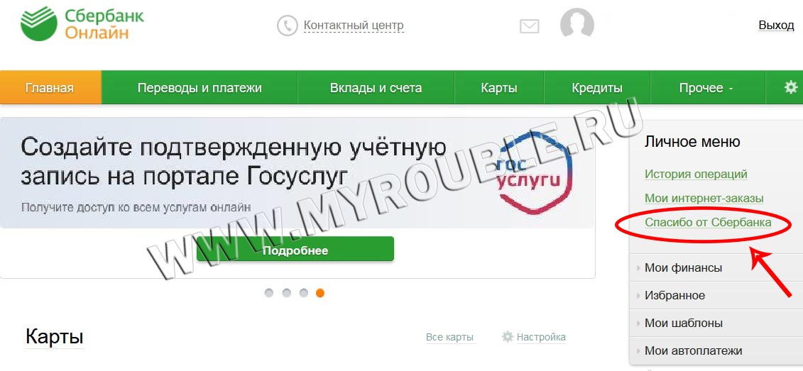 - В личном меню справа выбираем пункт «Спасибо от Сбербанка».