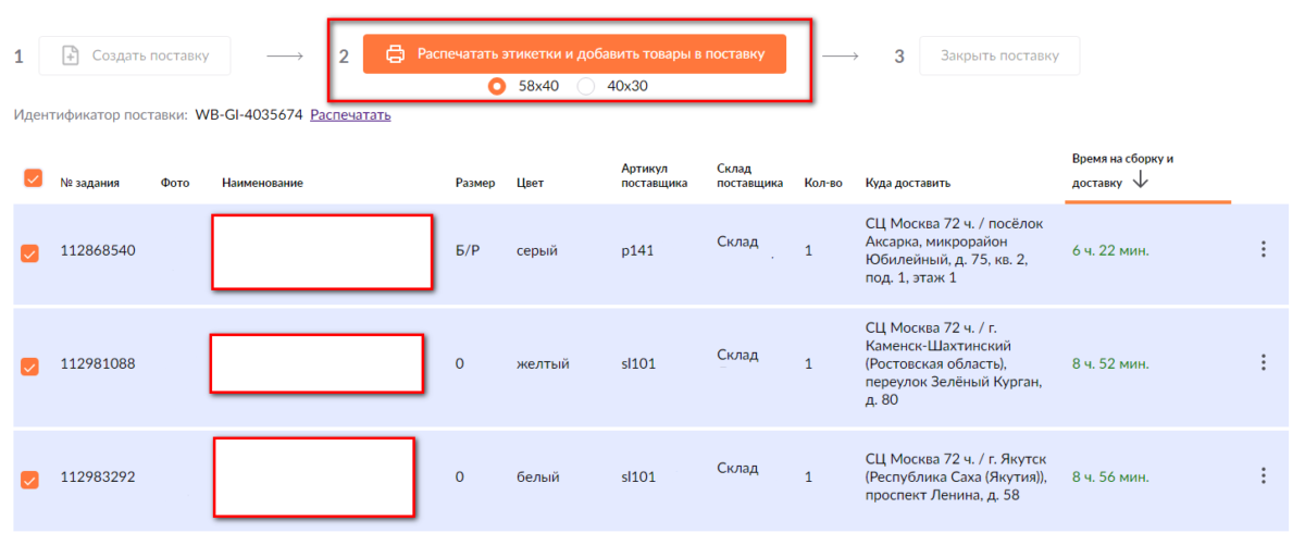 Нажмите на «Распечатать этикетки и добавить товары в поставку», предварительно выбрав размер этикеток (58х40 или 40х30). После этого Вам нужно упаковать товар и подготовить к отгрузке на склад, а для удобства вы можете скачать лист подбора.