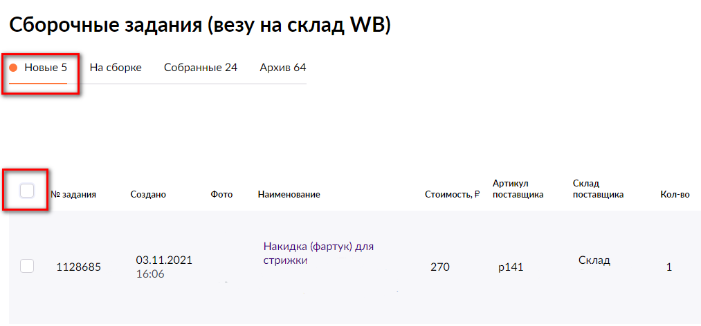 На следующем шаге передаем товар на сборку. Можно выбрать одно или несколько заданий, которые хотите передать на Сборку и подготовку к отправке на склад WB. Все задания можно выбрать, кликнув на чек-бокс, отмеченный на картинке: