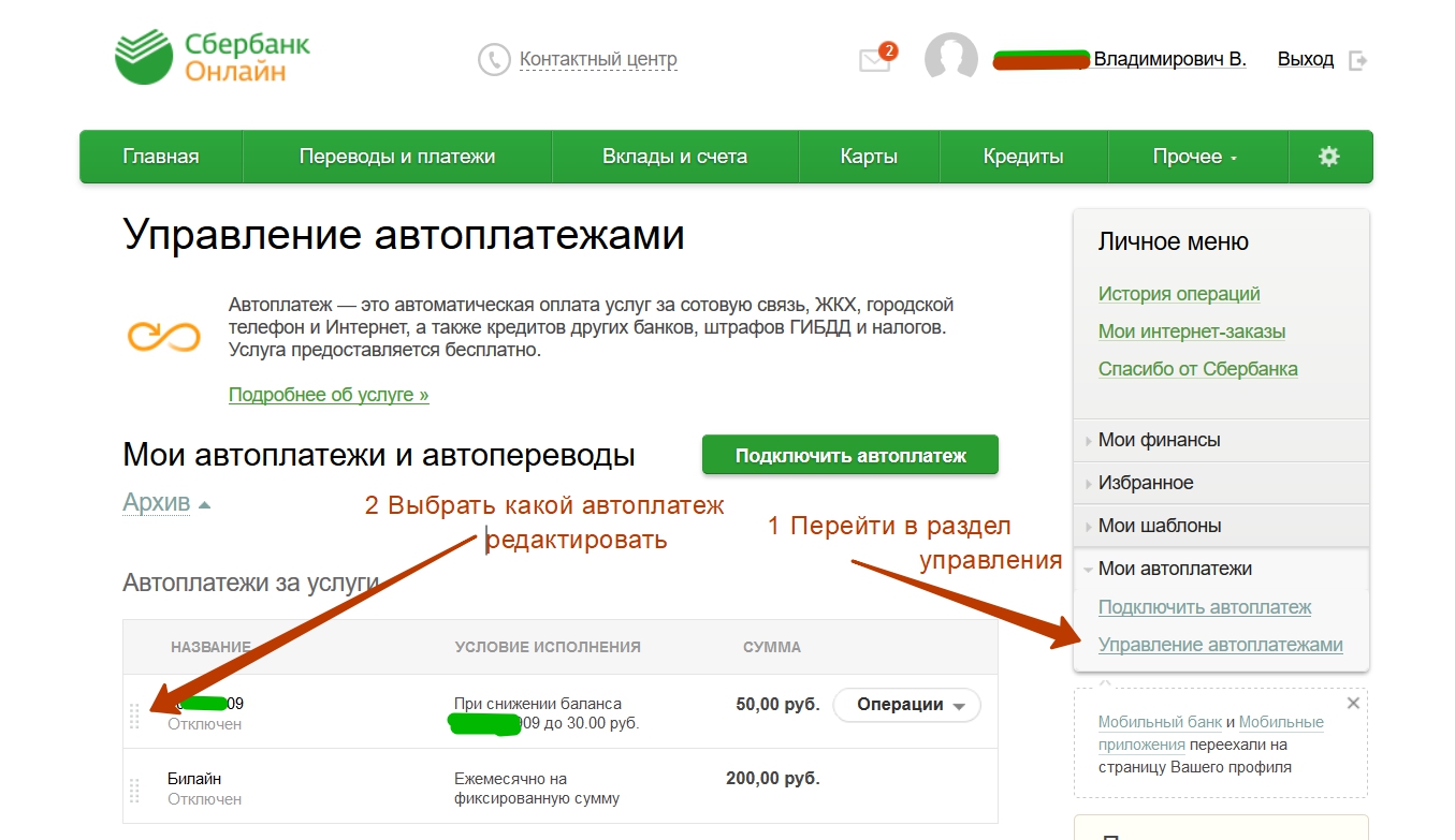 - В «Моих автоплатежах» выбрать «Управление автоплатежами».