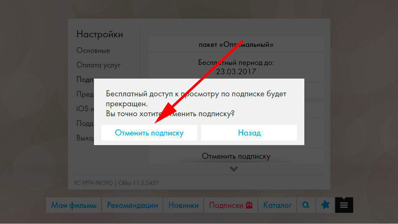 - На SmartTV. Необходимо зайти в настройки в меню телевизора. Найдите вкладку подписки, далее нажмите на кнопку «отключить автопродление». Подтвердите действия нажав «отменить подписку».