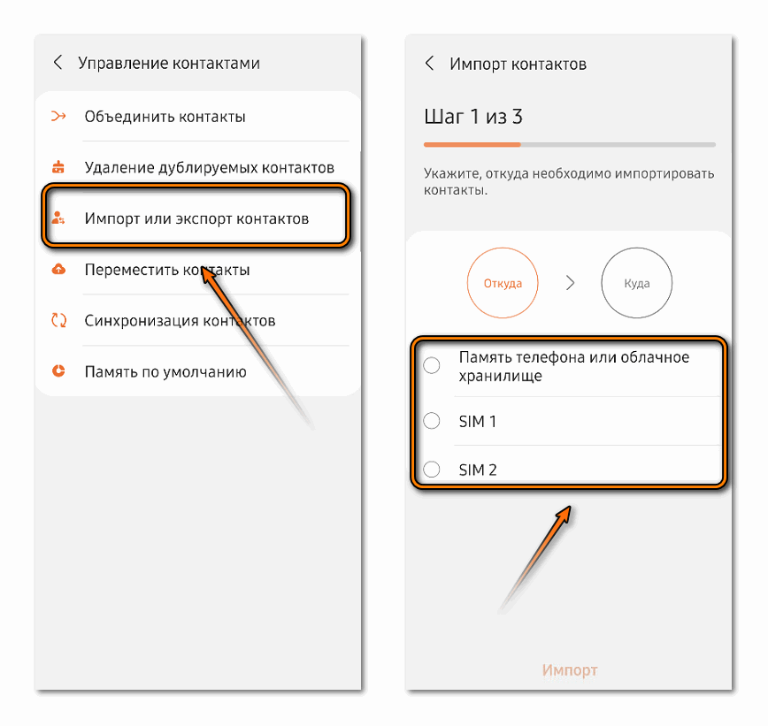 4) В новом аппарате откройте снова настройки экспорта/импорта контактов, выберите вариант «Импорт из накопителя SIM» , после укажите контакты, которые вам нужны и нажмите по «Импорт» . Скриншоты ниже в помощь.