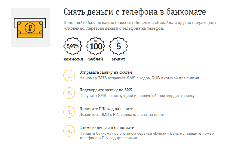Здесь нет никаких подвохов и действует единая ставка — 5,95% от снимаемой суммы. Главное, чтобы банкомат входил в число банков-партнеров Билайна.