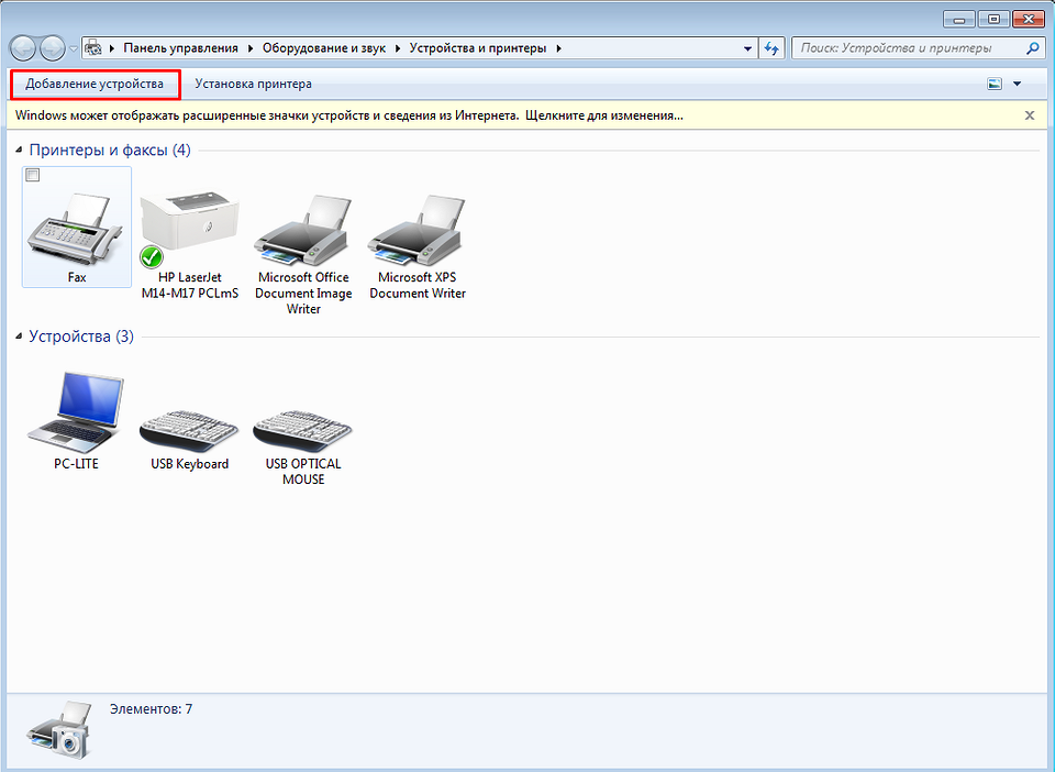 Переход к списку устройств. Для Windows 10 это можно сделать через «Параметры ПК», перейдя к ним из меню «Пуск». Для 7-й версии — через пункт «Устройства и Принтеры».
