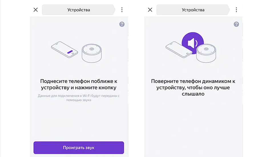Завершающий этап — выбрать «Проиграть звук». Сам телефон следует поднести поближе к колонке и повернуть к ней динамиком. Теперь осталось подождать несколько секунд, пока Алиса автоматически не подключится к Wi-Fi. После этого можно переходить к дальнейшим настройкам гаджета.