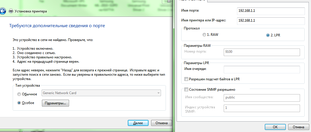 Ожидаем поиск устройства, выбираем наш. Если устройство не найдено, то жмем «Далее» и нам потребуется установить параметры порта, выбираем особое, в открывшемся окне выбираем протокол LPR и водим любое наименование и имя очереди, нажимаем «Ок».