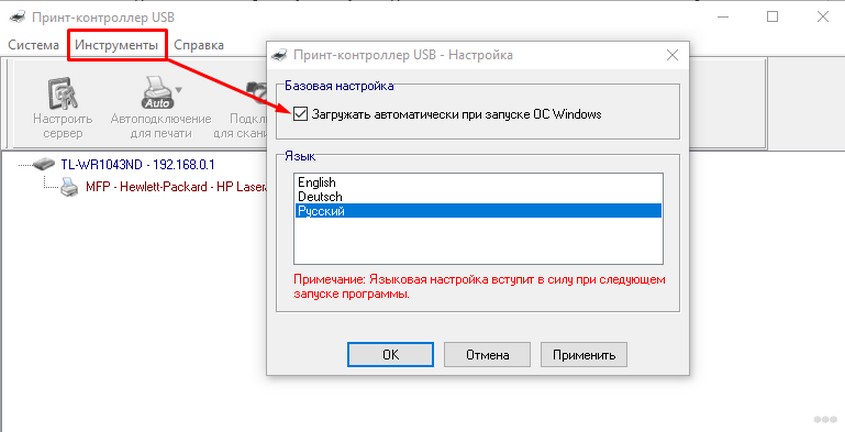 - Вот оно! При любой попытке печати принтер автоматически подключается. Самое главное — не забыть включить этот драйвер. Если вы вдруг захотите, чтобы программа загружалась немедленно, установите флажок в разделе Инструменты — Настройка: