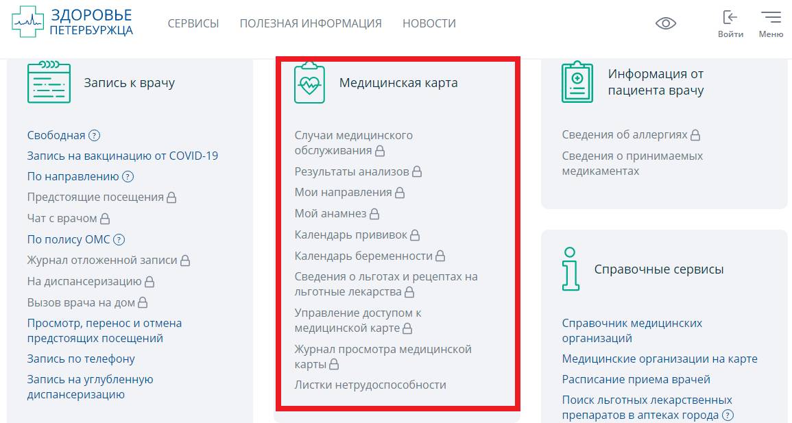 Несложно разобраться, где посмотреть электронную медицинскую карту, но надо еще понимать, как ею пользоваться, какие данные доступны. Функционал для всех примерно одинаковый, хотя дизайн отличается. У жителей Санкт-Петербурга такой список возможных действий в сервисе на сайте «Здоровье петербуржца»: